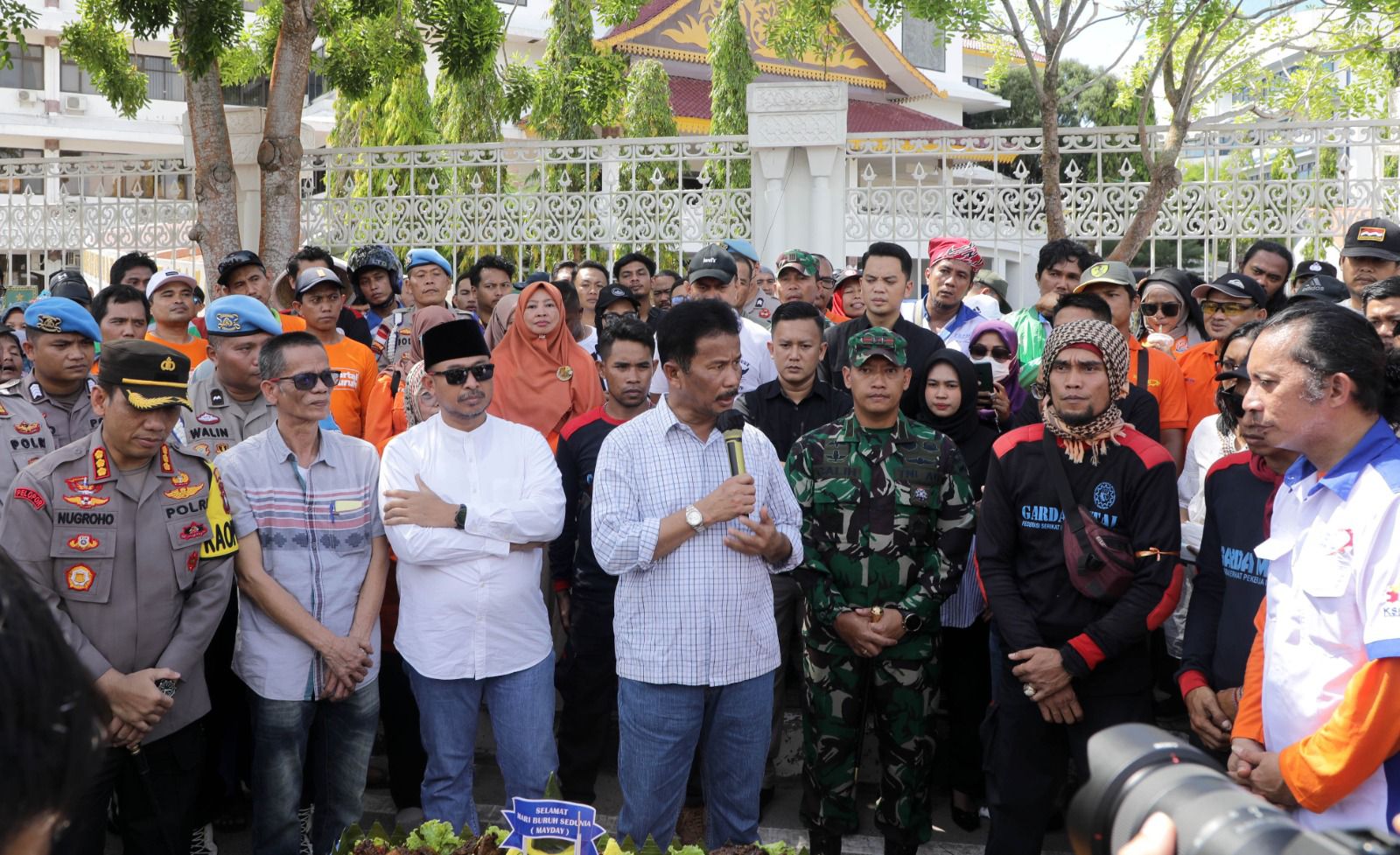 Wali Kota Batam Muhammad Rudi turun langsung menemui para buruh yang bergabung dalam serikat buruh yang ada di Kota Batam. Kehadiran Rudi pun disambut antusias oleh para buruh Batam.