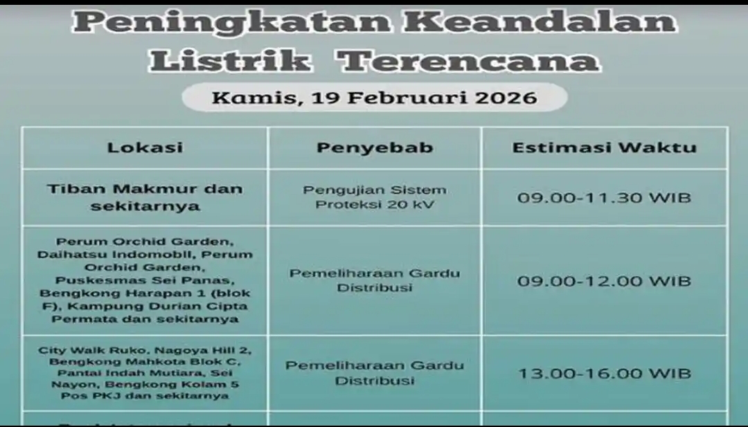 Batam, Fokuskepri.com – Manajemen Perusahaan Listrik Negara atau PLN Batam menginformasikan jadwal peningkatan keandalan listrik terencana hari ini, Kamis (19/2/2026).