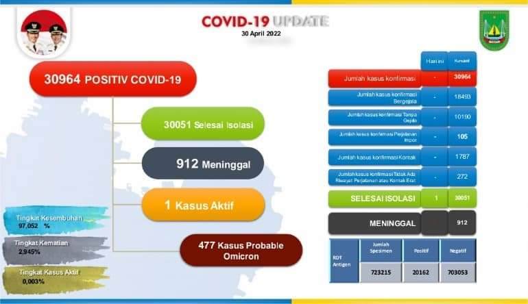 BATAM, Fokuskepri.com – Wali Kota Batam, Muhammad Rudi, mengungkapkan, hingga Sabtu (30/4/2022), kasus Covid-19 di Batam hanya tersisa satu pasien.
