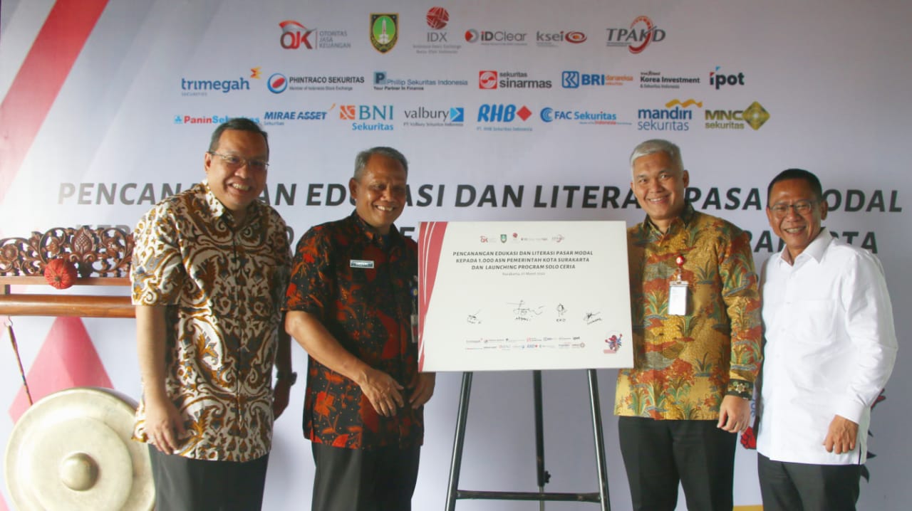 SURAKARTA, Fokuskepri.com – PT Bursa Efek Indonesia (BEI), bersama PT Kliring Penjaminan Efek Indonesia (KPEI), PT Kustodian Sentral Efek Indonesia (KSEI), didukung oleh Otoritas Jasa Keuangan (OJK) dan bekerjasama dengan Pemerintah Kota Surakarta, serta 15 Perusahaan Sekuritas di Kota Surakarta, secara simbolis melakukan penandatanganan Pencanangan Edukasi dan Literasi Pasar Modal kepada 1.000 Aparatur Sipil Negara (ASN) Pemerintah Kota Surakarta dan Launching Program Solo CERIA (Cerdas Investasi Aman) pada Selasa (07/03/2023).
