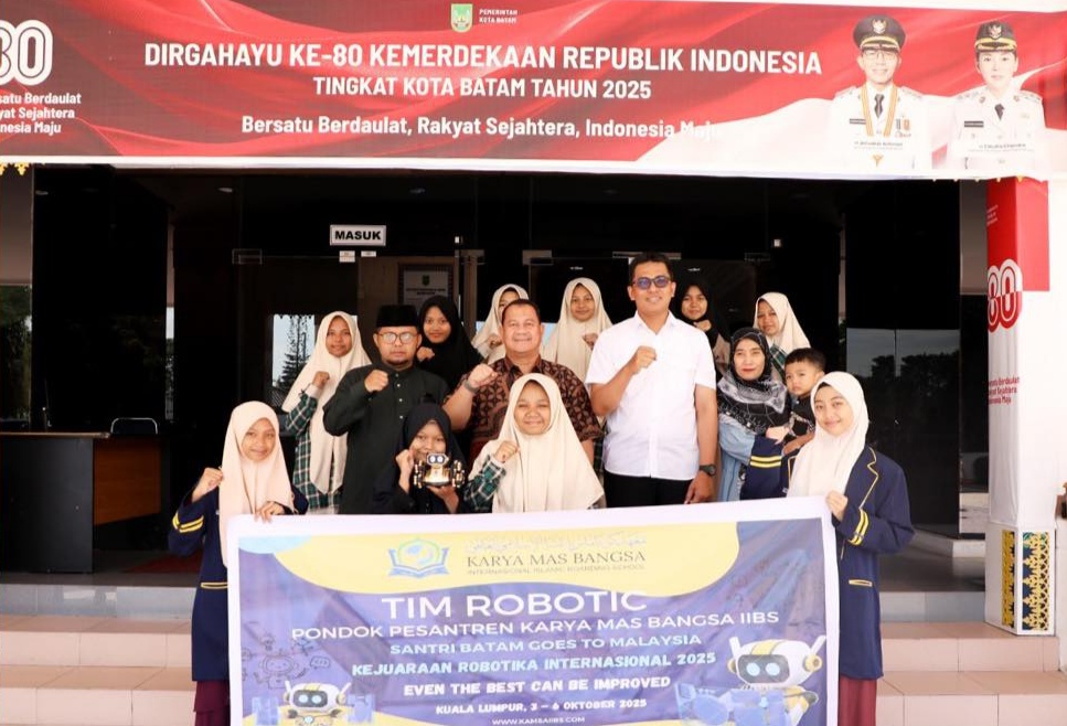 Batam, Fokuskepri.com – Wali Kota Batam Amsakar Achmad, diwakili Kepala Badan Riset dan Inovasi Daerah (Brida) Kota Batam Efrius melepas sejumlah santriwan dari pondok pesantren Karya Mas Bangsa IIBS Batam yang akan mengikuti lomba robotik internasional di Kualalumpur, Malaysia. Pelepasan tersebut berlangsung di Kantor Wali Kota Kota Batam, kamis (2/10/2025).